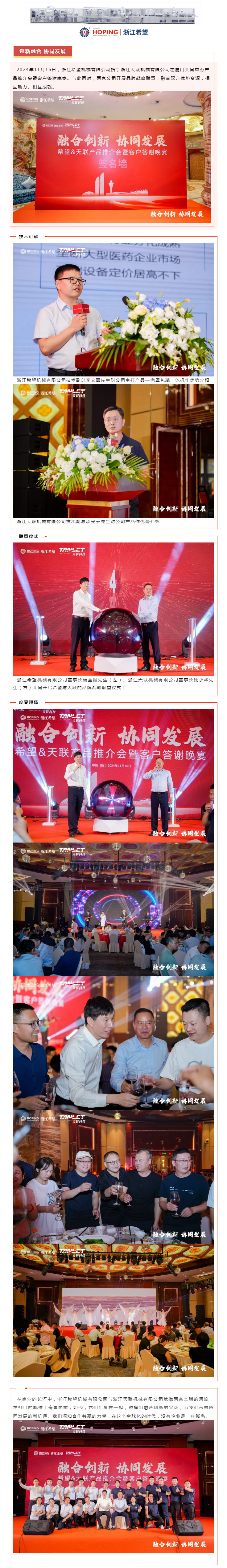 2024年11月16日,浙江希望機(jī)械有限公司攜手浙江天聯(lián)機(jī)械有限公司在廈門共同舉辦產(chǎn)品推介會(huì)暨客戶答謝晚宴。