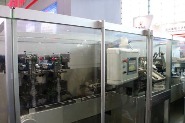 “DHL700全伺服高速泡罩裝盒一體機(jī)速度可達(dá)700板/分鐘及400盒/分鐘,通過公司自主研發(fā)的IRB24智能機(jī)器人追蹤移送系統(tǒng)將格柵輸送上的泡罩板轉(zhuǎn)送到并行的裝盒機(jī)料倉輸送上,這種輸送方式不僅縮短了流水線長度,而且生產(chǎn)效益(OEE)得到升級,穩(wěn)定性得到保障,以及結(jié)合多道格柵輸送,能夠?qū)崿F(xiàn)多板的疊加。”現(xiàn)場工作人員介紹,DHL700全伺服高速泡罩裝盒一體機(jī)還可實現(xiàn)內(nèi)外包隔離生產(chǎn),突破了此種機(jī)型國際同行目前格柵輸送內(nèi)外包互通的狀況,給藥品包裝帶來安全保障。